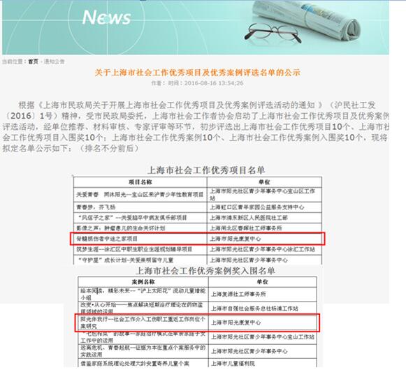 市阳光康复中心荣获上海市社会工作优秀项目及优秀案例入围奖