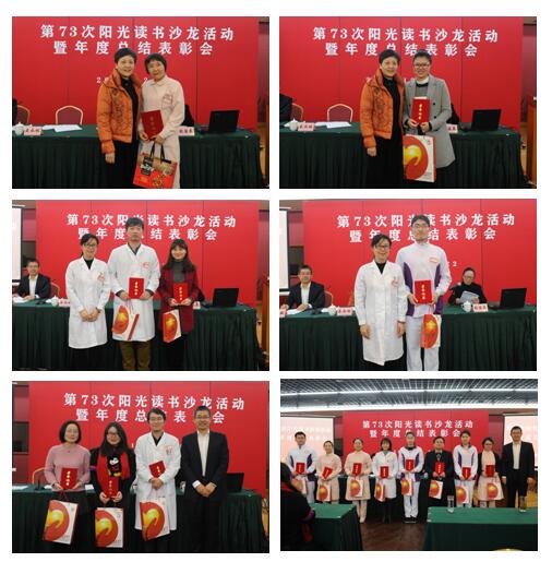 随后的年度表彰环节,在一段由2016年历届沙龙精彩瞬间组成的PPT带领成员们再次感受到了读书沙龙的魅力。医院(中心)副主任傅传威从领导重视、精心组织;内容丰富、形式多样;积极参与、学有成效三方面,对全年读书沙龙作回顾总结。医院(中心)副主任翟华宣读了《关于表彰2016年度“阳光读书沙龙”活动优秀个人和集体的决定》,现场表彰优秀交流奖、优秀体会奖、优秀征文奖、优秀笔记奖、优秀组织奖获奖名单并颁奖。