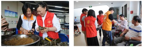 在医院(中心)食堂,志愿者们提前准备好了糯米、肉、粽叶、绵线等包粽子材料。活动现场,众人围作一圈,互相交流,互相学习,卷叶,舀米,加肉,再绕线缠紧,不一会儿,一个个有棱有角的粽子就出现了,整个活动现场欢声笑语、其乐融融,半天下来,400多个粽子全部完成,最后大家将蒸煮后热气腾腾的粽子送到医院(中心)中途之家伤友及家属们手上和社区老人家中,为他们提前送去了节日的祝福。
