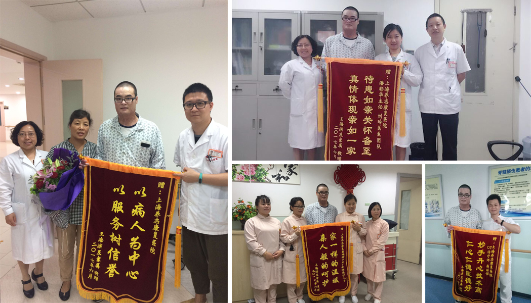 6月19日,正在市养志康复医院(市阳光康复中心)康复的“平安英雄”、“上海好邻居”王海滨为医院(中心)的医治护团队各送上一面锦旗,感谢大家在他康复期间的精心治疗和贴心服务。