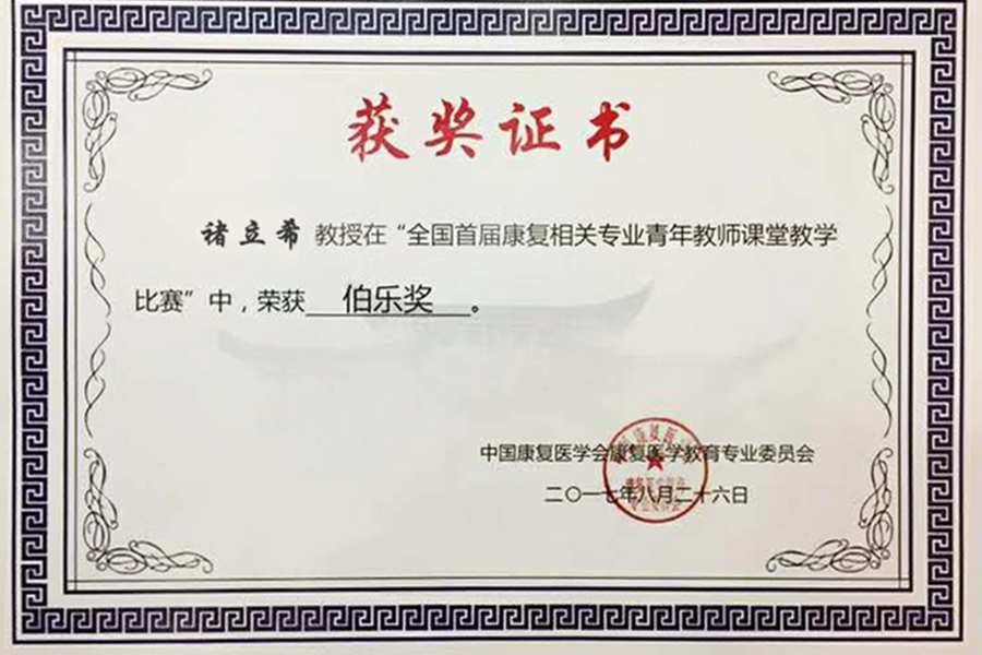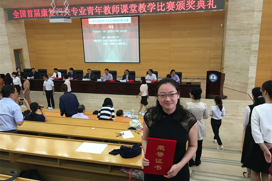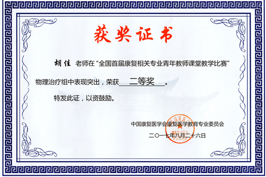 8月25日,全国首届康复相关专业青年教师课堂教学比赛在昆明医科大学举办,来自全国57所高校的79名青年教师参与此次比赛。同济大学医学院康复治疗学系老师、医院(中心)科研教学培训科副科长胡佳获得本次大赛物理治疗组二等奖,指导老师褚立希教授获伯乐奖。