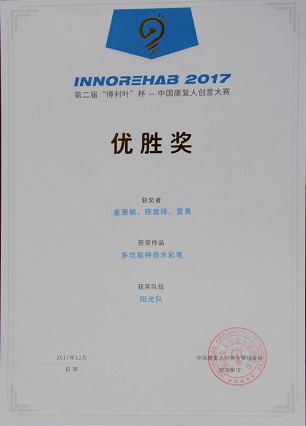 “傅利叶”杯中国康复人创意大赛是一个为全国各康复医疗机构和科研机构的一线康复工作者和科研人员提供创意展示和孵化平台的大赛,能够实际解决康复问题的创意作品都有可能被选中进入实际的产、学、研、用、资的产品孵化过程。“多功能神奇水彩笔”的出现,不仅能应用于临床中存在上肢及手部功能发育迟缓或功能障碍的特殊儿童,还能应用于存在手部协调操作能力弱、书写情况差的一般儿童,为儿童在形成良好绘画和书写能力上奠定坚实基础,同时也为临床一线的儿童康复治疗师增添一款优良有效的训练器具。