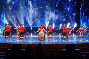 随着音乐的缓缓响起,希望之家艺术团团长潘静优美动人的身姿出现在观众眼帘。随后,艺术团的伤友们身坐轮椅闪亮登场,他们用热情洋溢的舞蹈、丰富细腻的情感、阳光温暖的笑容,呈现了别开生面的轮椅舞《生命礼赞》,赢得了观众们的阵阵掌声。
