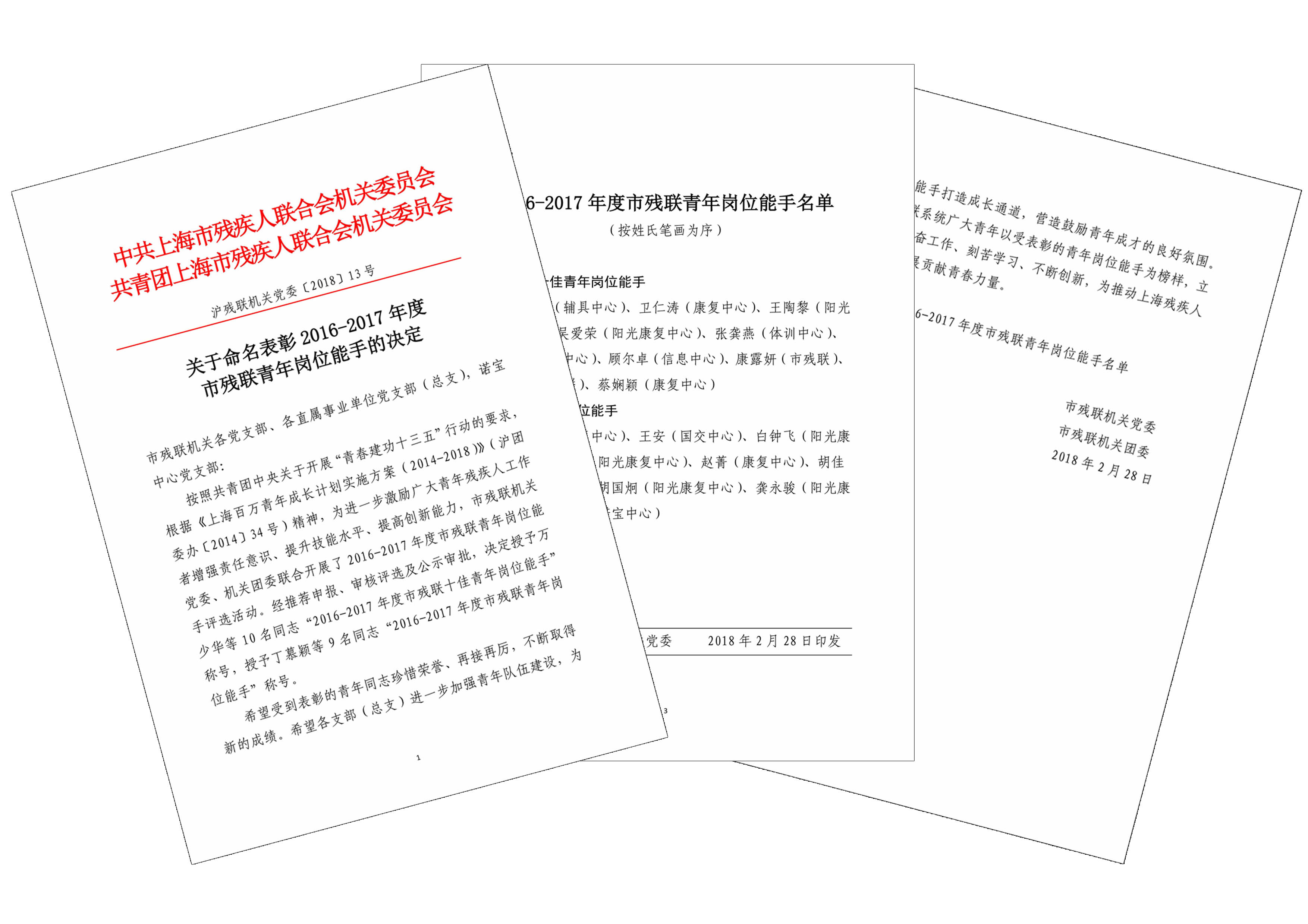 近日,在由市残联组织开展的“2016-2017年度市残联青年岗位能手和杰出青年岗位能手评选活动”中,医院(中心)员工王陶黎与吴爱荣获得“2016-2017年度市残联十佳青年岗位能手”称号,白钟飞、孙逸舟、胡佳、胡国炯和龚永骏获得“2016-2017年度市残联青年岗位能手”称号。