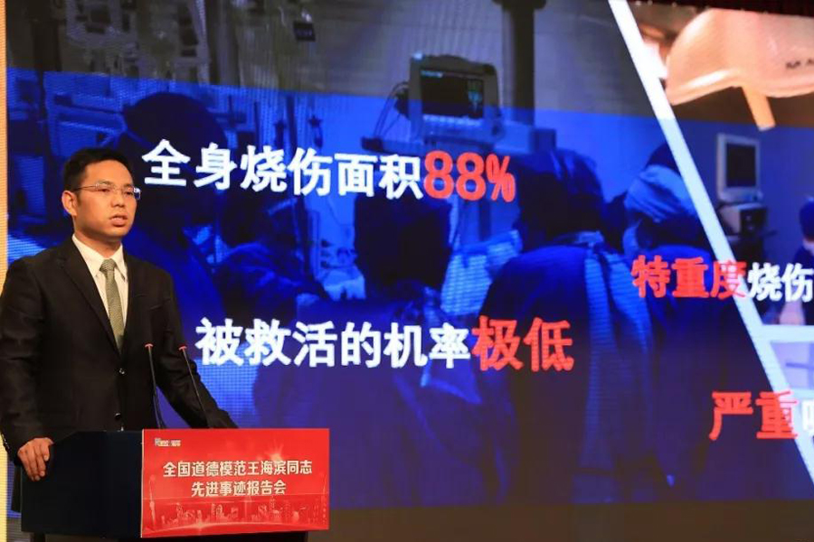 报告团成员共有5人,靳仲夏医生作为王海滨的主治医生,在救治海滨的过程中与他结下了深厚友谊。他从医生的视角,讲述海滨抢救、康复的整个过程及海滨生理、心理所遭遇的巨大考验,充分展现了海滨的坚韧和刚强,海滨的不易和医护人员的坚持让台下观众潸然泪下,深受感触。