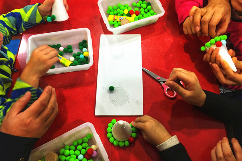 活动中,家长与小朋友们认真聆听了老师关于如何制作圣诞树的指导,志愿者们把提前准备好的圣诞树材料分发给在场家庭,并手把手教授孩子和家长们如何制作圣诞树,小朋友们在过程中用不同颜色的小毛球一点一点的将自己手上的圣诞树装饰出来,欢乐积极地与家长们一起制作出了一个个可爱又充满童趣的圣诞树。最后,每组家庭展示分享了自己的制作成果,家长与孩子在互相配合中感受到了动手操作的快乐,大家纷纷对本次活动表示满意。