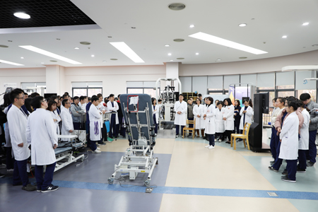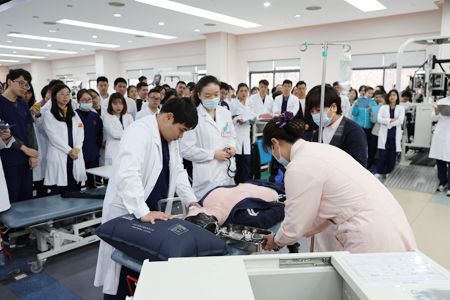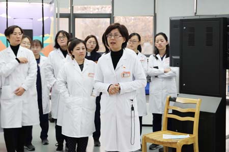 在物理治疗大厅内,模拟演练有条不紊地开展着。情景设定下,一名在接受康复治疗的门诊患者突然癫痫发作,意识丧失。责任治疗师作为第一发现人,按照《门诊患者突发疾病应急预案》流程进行处置,同时发出信号呼叫门诊急救小组,治疗大厅护士迅速将抢救车、氧气枕等急救设备推至患者旁,协助治疗师摆放体位,打开患者气道,2分钟内急救小组到场。以内科卫玉洁医师为主的医疗小组,指挥现场实施急救,加压给氧、保护患者肢体关节、药物治疗……10分钟后,患者神志恢复,躯体抽搐停止,转门诊留观室继续观察或转上级医院进一步治疗,卫玉洁医师宣布应急处置成功。