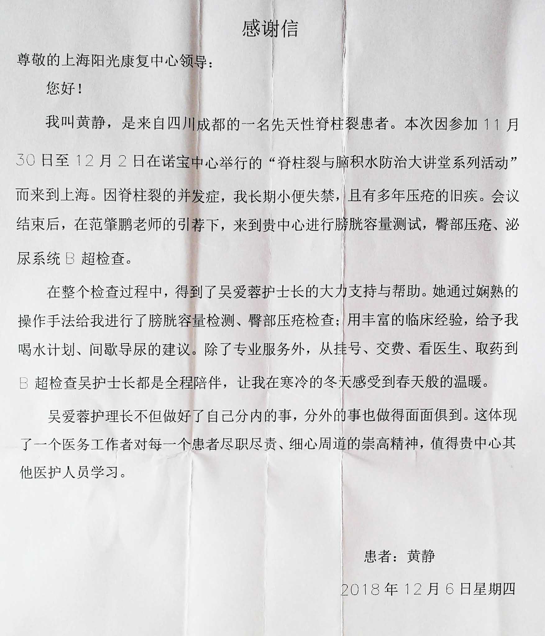 她在信中写到“在整个检查过程中,得到了吴爱荣护士长的大力支持与帮助。她通过娴熟的操作手法给我进行了膀胱容量检测、臀部压疮检查;用丰富的临床经验,给予我喝水计划、间歇导尿的建议。除了专业服务外,从挂号、交费、看医生、取药到B超检查,吴护士长都是全程陪伴,让我在寒冷的冬天感受到了春天般的温暖。