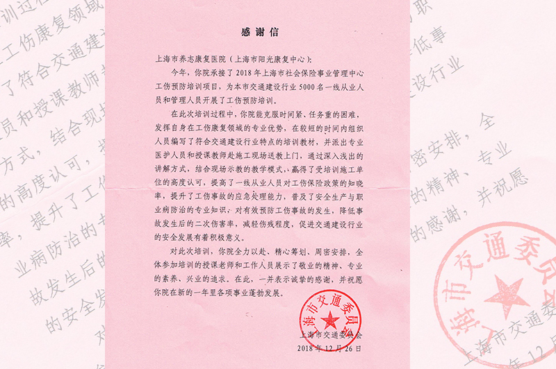 近日,医院(中心)收到一封来自上海市交通委员会的感谢信,对我院为5000名交通建设从业人员开展工伤预防培训工作表示感谢。