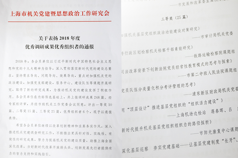 在上海市市级机关开展的“2018年机关党建暨思想政治工作课题研究”工作中,医院(中心)党总支送选了《新时代提升机关基层党组织组织力的路径探析——上海市养志康复医院(上海市阳光康复中心)的探索与实践》一文,从248篇研究课题中脱颖而出,荣获三等奖。