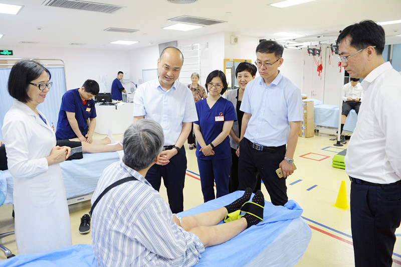 乐永林院长首先向胡主任一行简要介绍了我院发展历程、功能定位、规模设置等情况,并陪同参观了康复门诊、康复治疗大厅等区域,胡主任通过询问患者康复情况、查阅职业康复的评估及训练记录等深入了解我院各科室开展的特色业务及康复治疗情况。