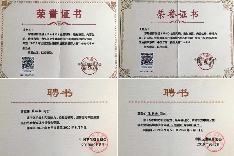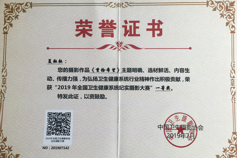 9月4日-7日,由中国卫生摄影协会主办的2019年全国卫生健康系统纪实摄影大赛在湖北恩施举行。医院(中心)对外协作科夏耘耘的摄影作品《重拾希望》荣获一等奖与“金质优秀收藏作品”奖项,摄影作品《陪伴》获同期举行的2019年全国卫生健康系统“中国年味”摄影大赛二等奖。