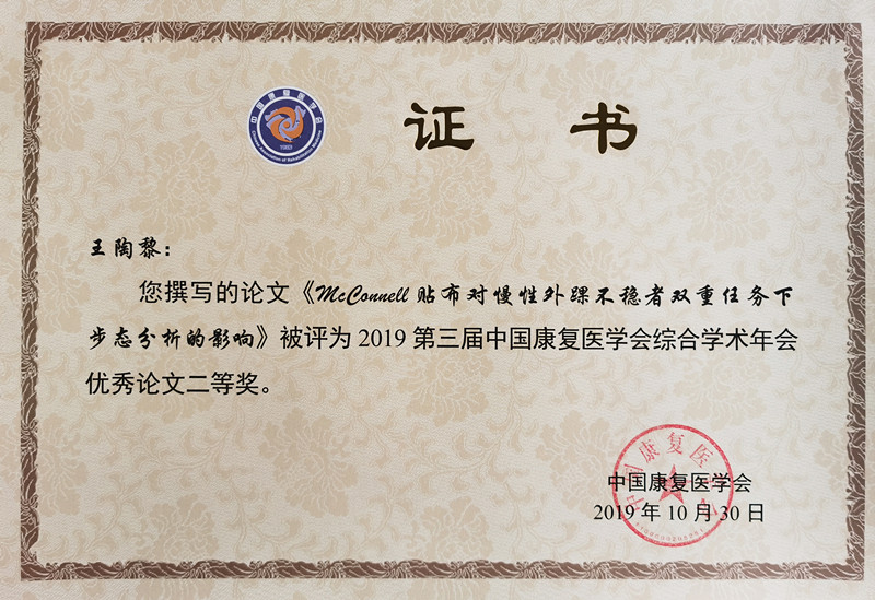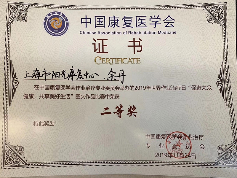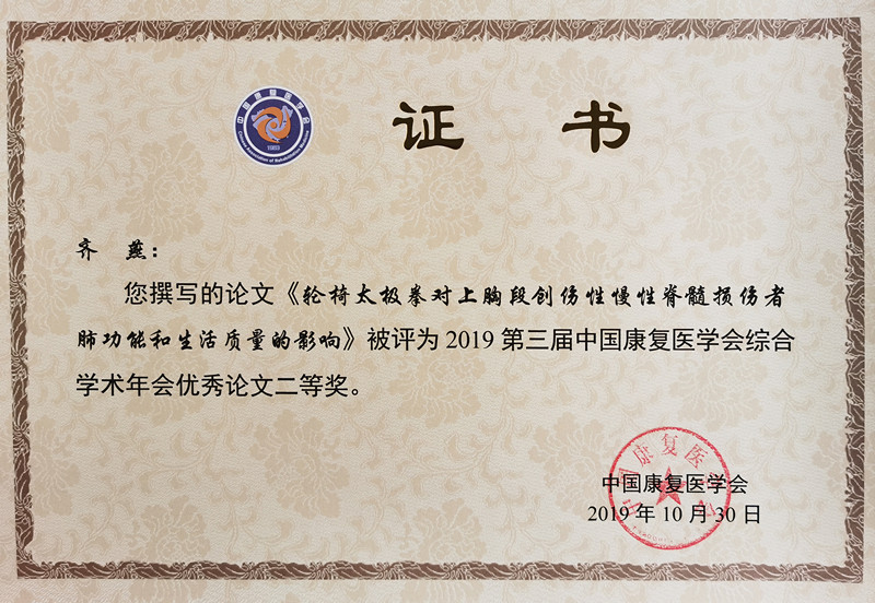 我院团队项目《脊髓损伤者“希望之家”全面康复模式的构建与推广》获得本次2019年度中国康复医学会科学技术奖二等奖;在“优秀三师”评选活动中,职业社会康复科护士长高彩萍被评为“2019年度优秀康复护师”;在“优秀青年三师”评选活动中,康复治疗部副主任陆佳妮被评为“2019年度优秀青年康复治疗师”;脊髓损伤康复科医生齐燕的论文《轮椅太极拳对上胸段创伤性慢性脊髓损伤者肺功能和生活质量的影响》与职业社会康复科医生王陶黎的论文《MCCANNELL 贴布对慢性外踝不稳者双重任务下步态分析的影响》分获“优秀论文二等奖”;在中国康复医学会作业治疗专业委员会举办的2019年世界作业治疗日“促进大众健康、共享美好生活”图文作品比赛中,我院作业治疗师余丹获二等奖。