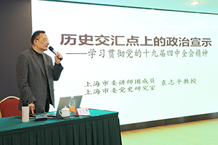 会上,袁志平教授围绕“学习党的贯彻十九届四中全会精神”,提炼了“自信、自觉、自强”三个关键词,分别从“自信:制度和治理体系为新中国发展进步提供了根本制度保障;自觉:顺应时代潮流体现出强烈的问题导向和鲜明的实践特色;自强:回答了制度和治理体系如何坚持和巩固、完善和发展的问题”三个方面由浅至深、详细解析了十九届四中全会精神。袁教授用诙谐幽默的语言、生动有趣的事例、清晰形象的图解,教育引导党员群众学习好贯彻好党的十九届四中全会精神,鼓励大家读原著、学原文、悟原理、讲传承,为上海建设发展提供不竭动力。