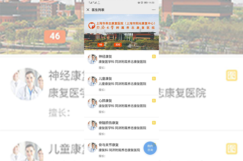 第一批开设的线上咨询科室,除了眼科、口腔科、耳鼻咽喉科、精神心理科外,特别开设了由医生、治疗师联合提供的康复专科类咨询,涵盖儿童康复、骨与关节康复、神经康复、心肺康复、脊髓损伤康复等亚专科,并将于后期陆续增加其他线上咨询科室,以满足更多患者的需求。