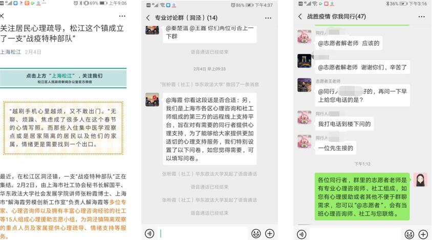 自2月2日起,医院(中心)“解海霞劳模创新工作室”与心理科联合上海市社工协会秘书长解国平、华东政法大学社会发展学院讲师张粉霞博士等多位专家、心理咨询师以及拥有丰富心理咨询经验的社工等组成心理援助志愿小组,为松江区洞泾镇隔离观察的重点人员及家属提供心理疏导、情绪支持等服务。