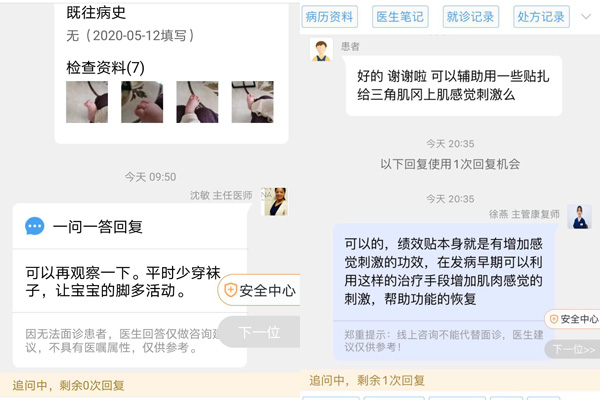 问诊期间,我院医治团队根据患者们的病症图文描述,以联合问诊的方式,就颈椎痛、肩关节疼痛、脑梗、下肢肌张力高、褥疮、烫伤、尿路感染、头晕恶心、儿童足内勾等多个方面的问题提给予康复建议,用耐心真诚的态度、细致专业的指导,收获了患者们的一致好评。