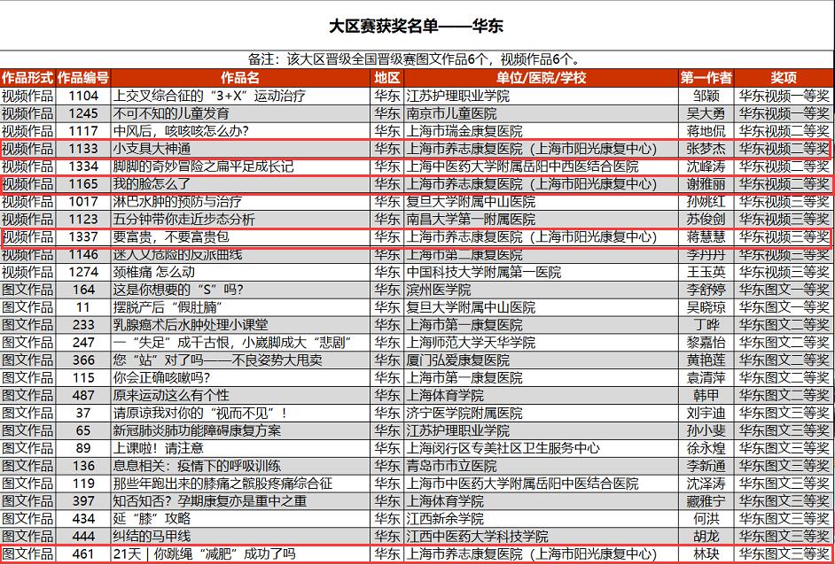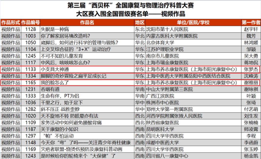 本次大赛分为地区赛、全国晋级赛、全国总决赛,以视频作品或图文作品的形式进行分开评比。经过专家评审的线上评选,我院4个科普作品从全国300多家医院、学校和机构的825个作品中脱颖而出。其中,治疗师张梦杰、何婷、杨栋团队作品《小支具,大神通》,治疗师谢雅丽、钱倩团队作品《我的脸怎么了》获得华东地区视频作品二等奖,同时获得全国晋级赛资格;治疗师蒋慧慧、吴萍萍、杨雪莲、马圣垚团队作品《要富贵,不要富贵包》获得华东地区视频作品三等奖,治疗师林珏、徐燕、倪嘉栋、李应国、卢仕伟团队作品《21天|你跳绳“减肥”成功了吗?》获得华东地区图文作品三等奖。