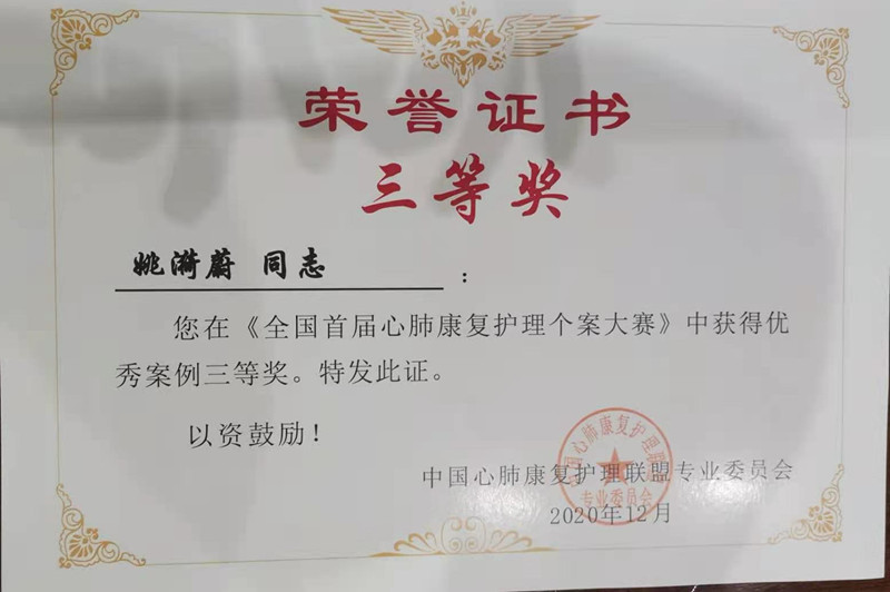 12月11日,由中国心肺康复护理联盟专业委员会主办的全国首届心肺康复护理个案大赛在昆明举行。我院重症康复病房护师姚漪蔚获优秀案例三等奖。