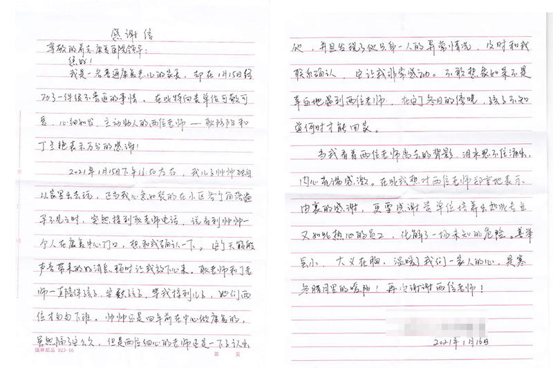 信中这位家长情真意切的记述了一件感人的暖心事:这位患儿独自出门玩耍,其家长久寻不见心急如焚,碰巧患儿走到浦东门诊部门口时,被我院耿防阳和丁兰艳两位治疗师看到,虽然这位患儿是四年前来我院做的康复治疗,但是治疗师们还是一眼认出了小朋友,并第一时间联系到了这位家长,期间治疗师们也一直安慰陪伴着患儿,直到家长到来。