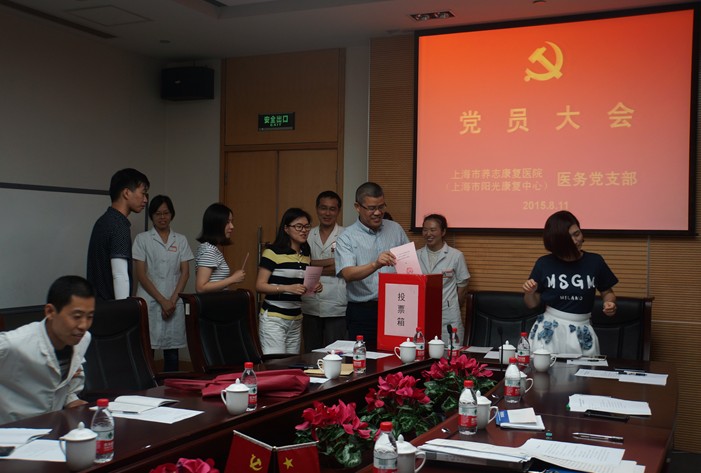 根据沪阳康党总支[2015]1号文件《上海市养志康复医院(上海市阳光康复中心)工作实施方案》,通过前期的认真部署、有序组织,在学习、动员的基础上,经无记名公推初选、征求意见、考察公示等工作流程,经中心党总支批准,医务党支部于8月11日中午召开了首届支部委员选举大会。