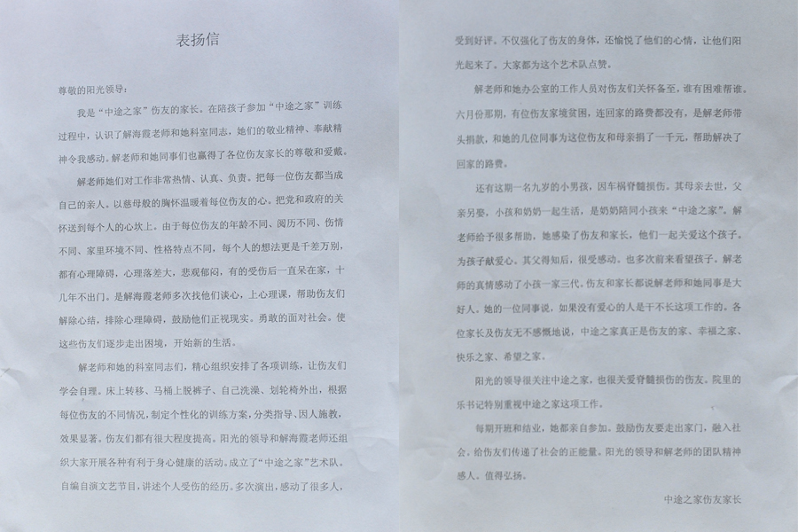 还有这期一名九岁的小男孩,因车祸脊髓损伤。其母亲去世,父亲另娶,小孩和奶奶一起生活,是奶奶陪同小孩来“中途之家”。解老师给予很多帮助,她感染了伤友和家长,他们一起关爱这个孩子,为孩子献爱心。其父得知后,很受感动,也多次前来看望孩子。解老师的真情感动了小孩一家三代。伤友和家长都说解老师和她的同事是大好人。她的一位同事说,如果没有爱心的人是干不长这项工作的。各位家长及伤友无不感慨地说,“中途之家”真正是伤友的家、幸福之家、快乐之家、希望之家。