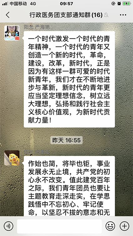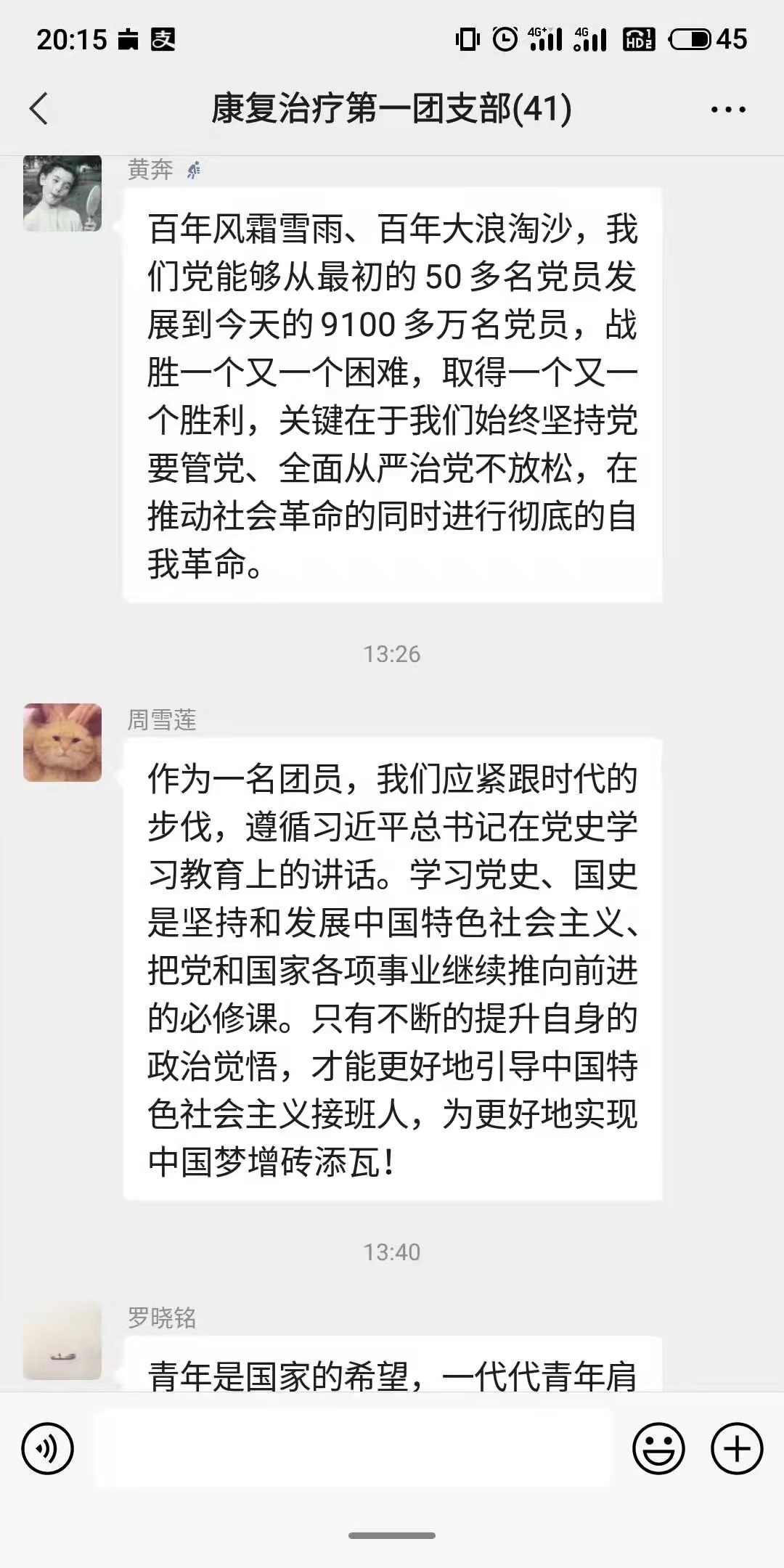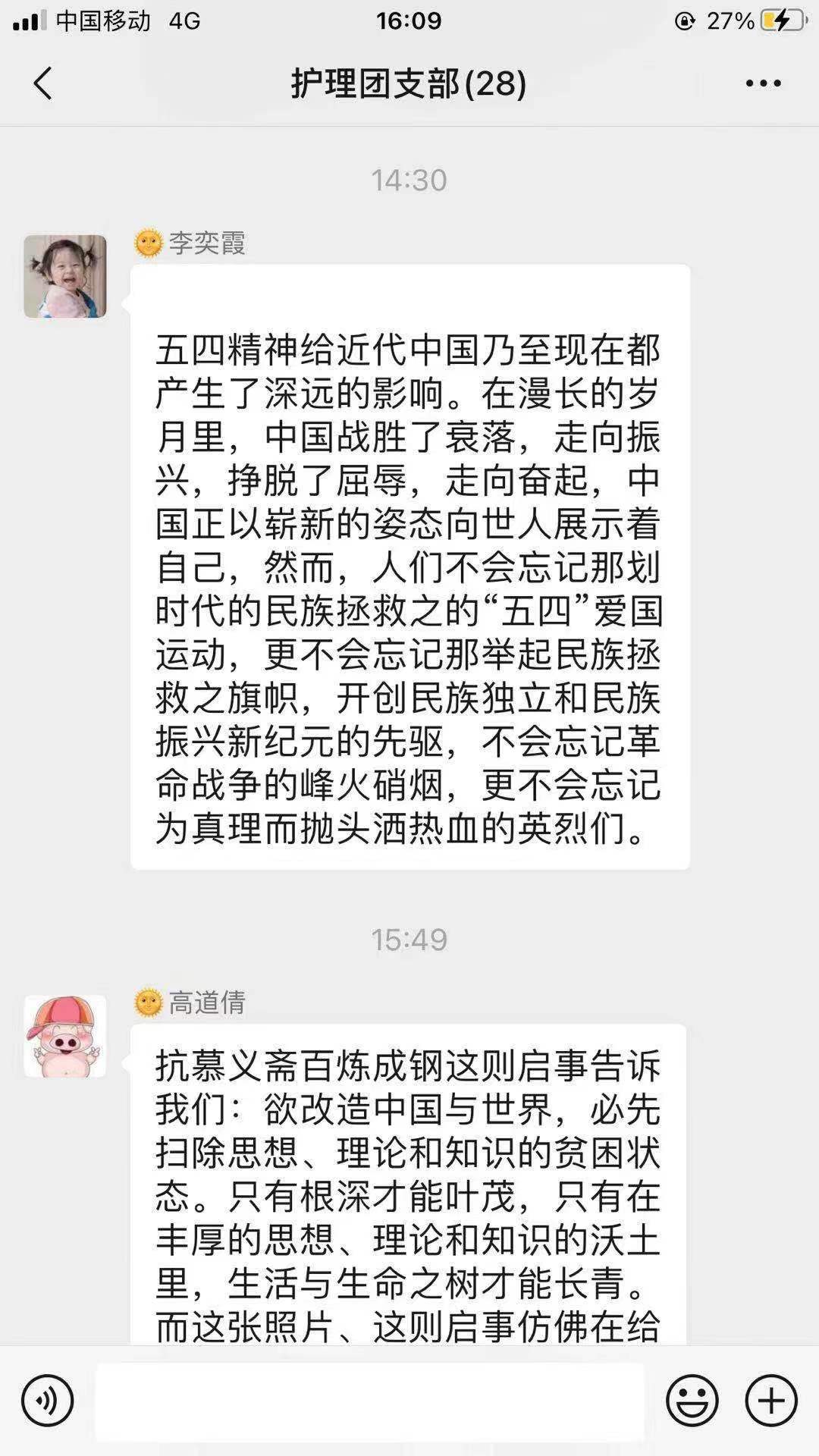 1919年的五四运动,如一道耀眼的闪电,冲破天空的阴霾。一百多年来,一代又一代青年在党的带领下砥砺奋进、激昂向上,五四精神早已融入民族血液,成为青年与国家血脉相连的重要精神支柱。为进一步提高团员青年理论学习水平,不断继承和发扬伟大的五四精神,培养团员青年爱国、爱党、爱团的坚定信念,激励团员青年干事创业,增强历史责任感和使命感,医院(中心)团总支5月4日当天组织全体团员青年开展线上学习活动。