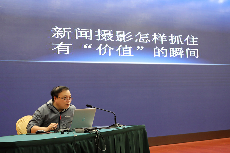 讲座中,邵竞老师以自己丰富的摄影经历,渊博的摄影知识,通过多幅新闻摄影作品,介绍了每张照片背后的故事,讲解了新闻摄影构图的五大基本原则等摄影理论知识。他深入浅出地讲解了如何把握新闻人物的神态、细节,突出主题,保证构图的完整性等新闻摄影的技巧。讲座内容丰富,讲解生动有趣且通俗易懂,极大地激发了大家的摄影热情。