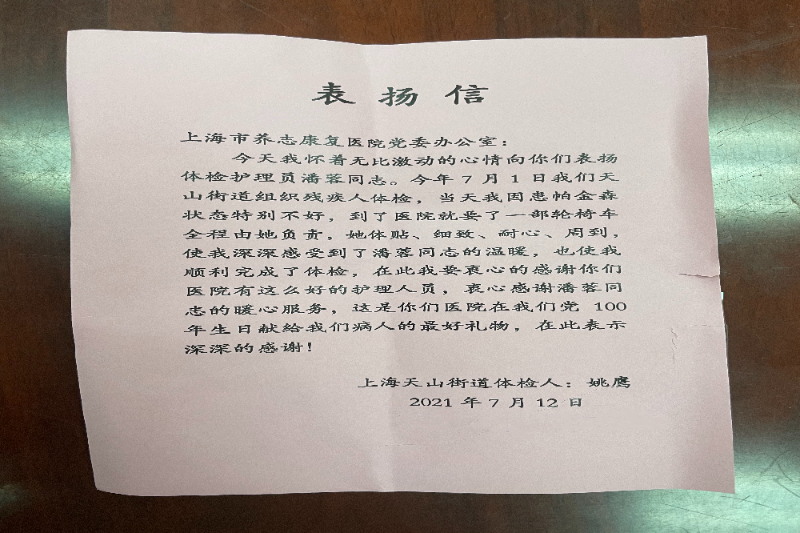 表扬信语言朴实、情感真挚,称赞体检中心人员“体贴、细致、耐心、周到”, 暖心服务更是“医院在我们党100年生日献给我们病人的最好礼物”!