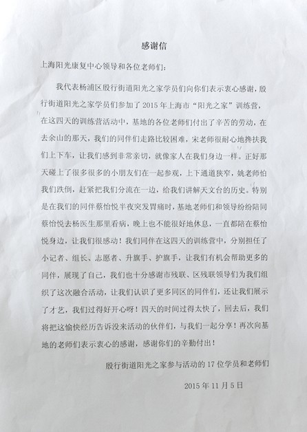 11月5日,阳光康复中心收到了一封来自杨浦区殷行街道“阳光之家”17位学员和工作人员的感谢信,信中表达了他们对中心阳光之家训练营老师辛勤付出表示感谢,对训练营活动主题和内容表示肯定,更对市残联和区残联提供此次参与活动的机会表示感恩。