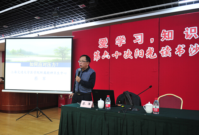 2015年的阳光,大事多、喜事多、承担的任务也多,面对强大的工作压力,为帮助员工调节情绪,了解并学会减缓压力的方法,12月1日中午,“爱学习,知识阳光”——第六十次阳光读书沙龙活动现场,中心特邀了上海交通大学医学院附属精神卫生中心蔡军教授,围绕“如何应对压力”主题,为近140名读书沙龙成员进行了专题讲座。