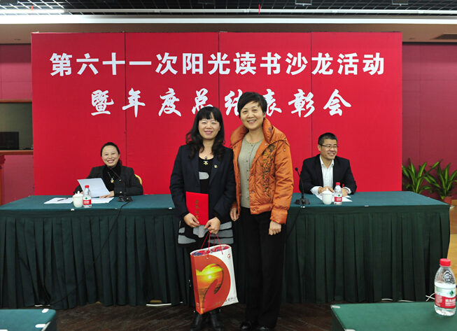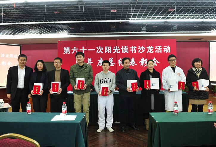 随后进行了年度表彰,在一段精心制作的PPT带领沙龙成员回顾了2015年度历届读书沙龙活动掠影后,中心副主任傅传威从多方重视、组织有序;形式丰富,内容实际;齐心协力、成效显著三个方面,对本年度读书沙龙作回顾与总结,分享了读书沙龙创办至今所取得的成果与荣耀,对中心各部门的积极参与给予充分肯定并深表感谢。中心党总支书记乐永林宣读了《关于表彰2015年度“阳光读书沙龙”活动优秀个人和集体的决定》,现场表彰优秀参与奖、优秀体会奖、优秀征文奖、优秀笔记奖、优秀组织奖获奖人员并颁奖。