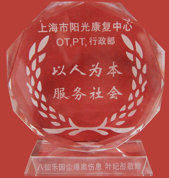 3月11日,台湾粉尘爆炸港籍伤员19岁女生叶纪彤在母亲的陪同下专程来到阳光康复中心,向在院康复期间给予她专业治疗和耐心服务的医务人员赠送水晶牌,表示感谢。