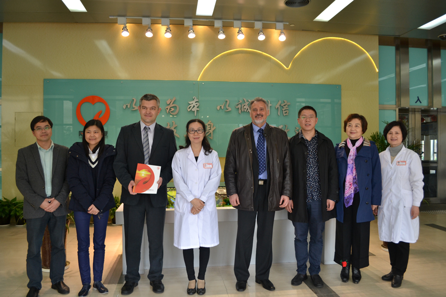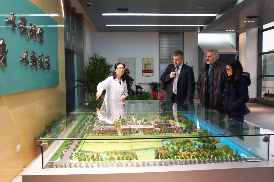 2016年4月12日,法国罗纳阿尔卑斯-中国经济文化促进帮助协会主席Patrice Mengual,法国萨瓦省智慧城市集团总裁Philippe Laurent在复旦健康管理培训学院院长张爱莉及松江区卫计委相关领导陪同下参观阳光康复中心。医院(中心)副主任翟华等陪同参观。