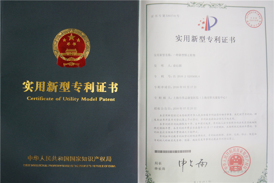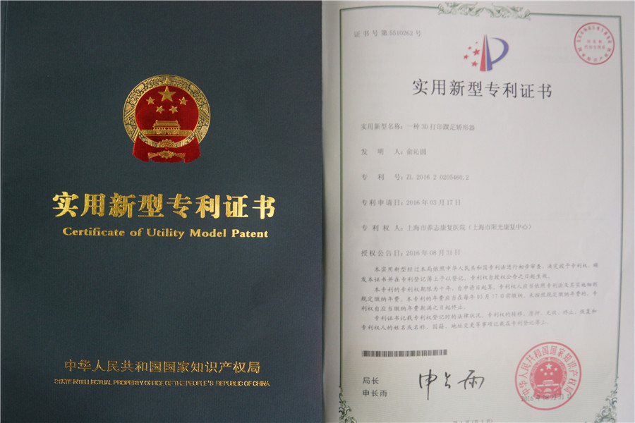 近日,市阳光康复中心康复工程科俞沁圆申请的两项实用新型专利“一种新型矫正鞋垫”、“一种3D打印踝足矫形器”获得国家知识产权局授权。