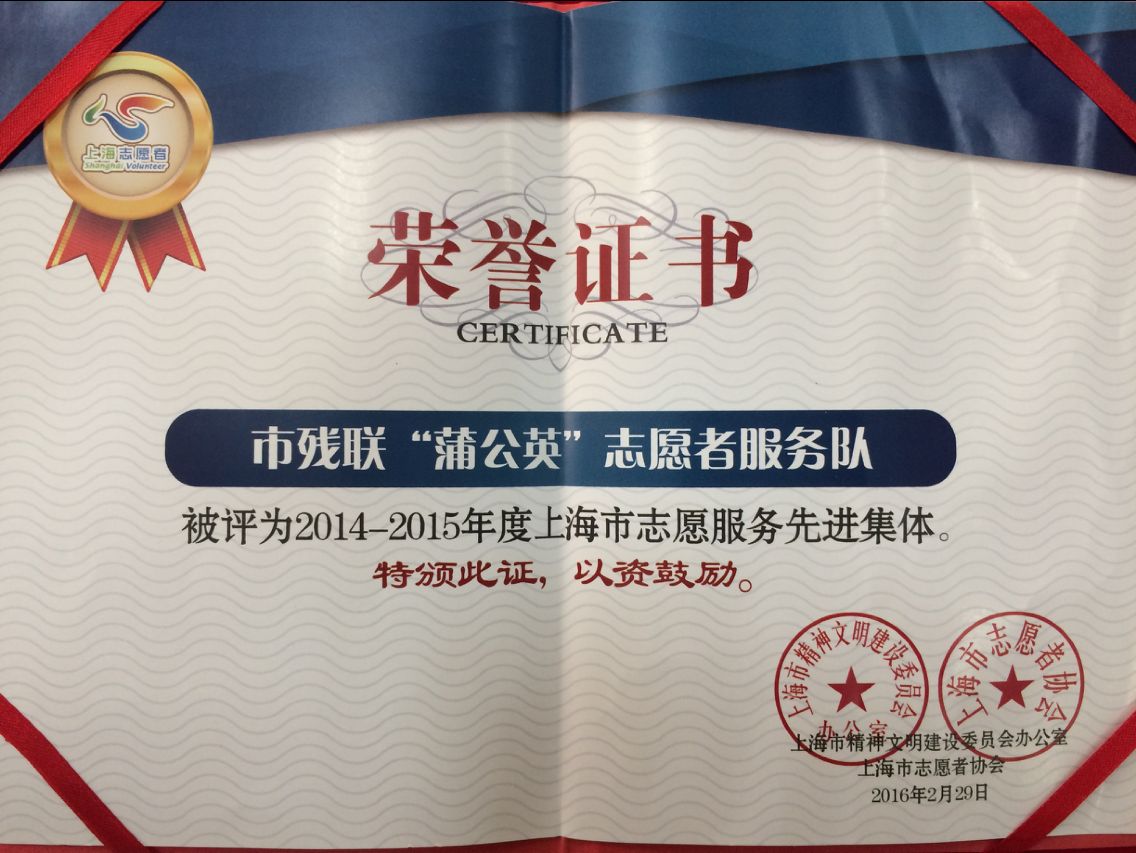 近日,市残联下属市阳光康复中心“蒲公英”志愿者服务队在市精神文明建设委员会和市志愿者协会共同开展的2014—2015年度志愿服务先进集体评选活动中,荣获上海市志愿服务先进集体。