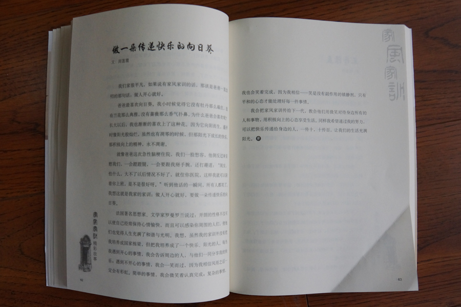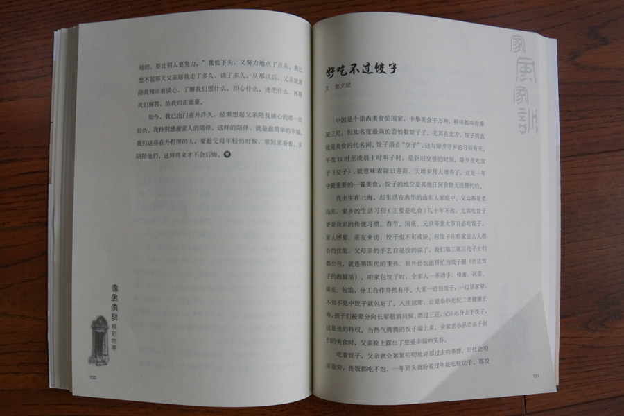 周莲霞同志的《做一朵传递快乐的向日葵》一文,用朴实的语言,生动讲述了一个平凡家庭的家风家训—做人要乐观向上。吕吉同志的《疼爱不溺爱》一文,用日常生活中的鲜活事例讲述了家庭教育中关于“爱的教育”的真谛,进而引出他们的家风家训——爱子女也要坚持原则。郭文斌同志的《好吃不过饺子》一文,通过讲述全家人团圆在一起吃饺子这一传统习惯,传递着一家人的亲情,传承着一个民族的传统美德。