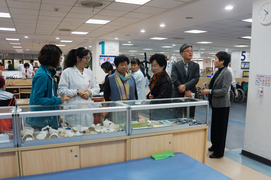 考察团一行首先听取了关于中心机构设置、人员配比、运行模式等情况的介绍,随后实地参观了康复门诊、康复治疗大厅及康复病区,深入了解医院(中心)康复项目开展情况与康复业务相关流程,交流学习中心康复工作开展的优势与经验。